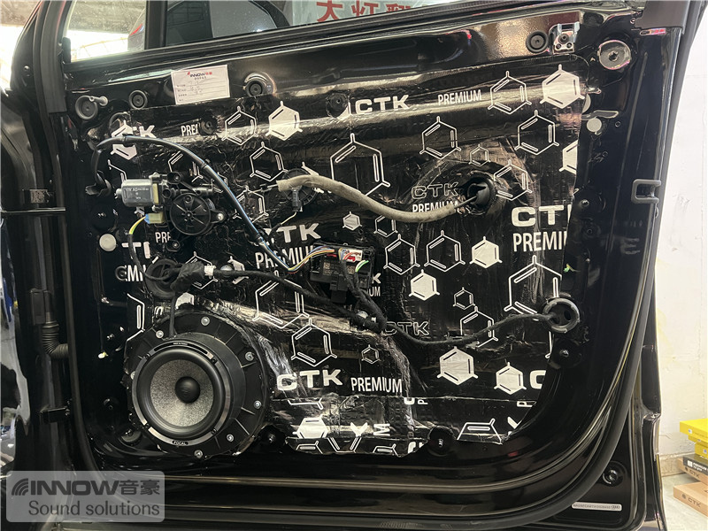 原车门板隔音措施欠缺,门板处产生的噪声会对音响品质产生非常大的影响。技师使用欧洲环保隔音CTK 欧尊止震板对门板做止振处理,减少门板处的噪声,为声场喇叭提供了一个良好的工作环境。