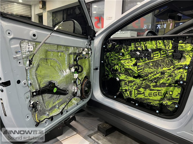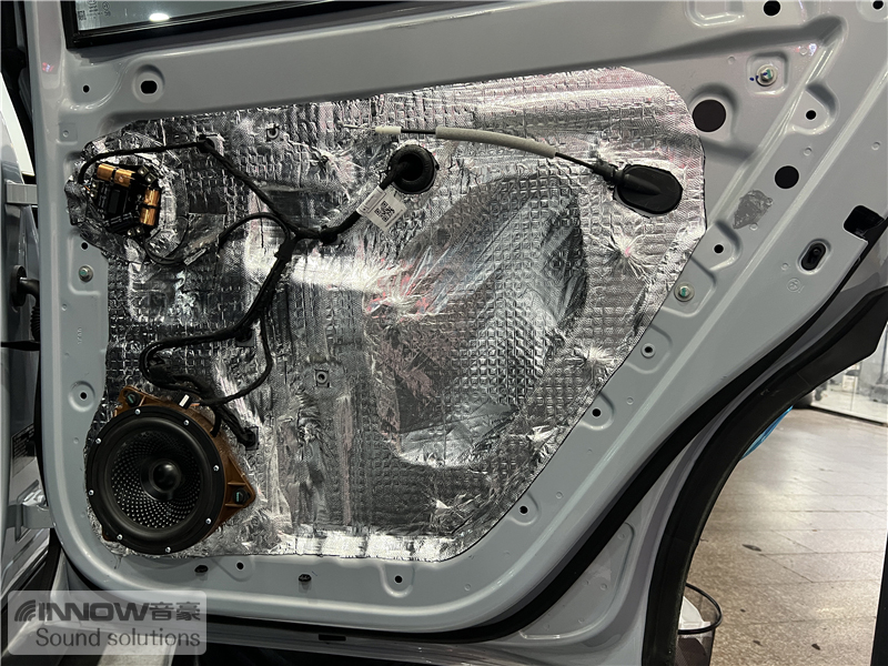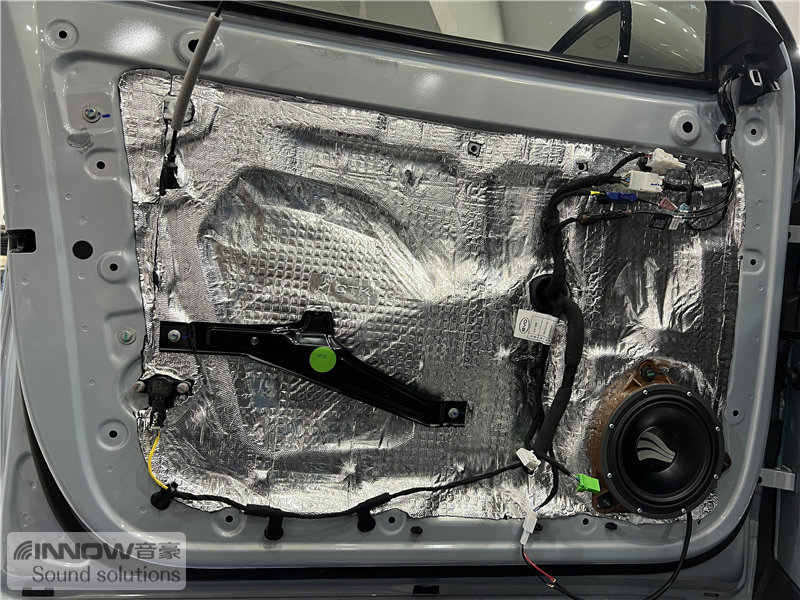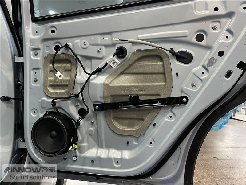 拆开汽车的门板饰盖以后可以看到,原车门板内部隔音措施较为欠缺,门板处产生的噪声会对音响品质产生非常大的影响。技师使用欧洲环保隔音CTK 欧铂止震板对门板及内饰做止振处理,让门板形成一个密封箱体,为声场喇叭创造了一个良好的工作环境。