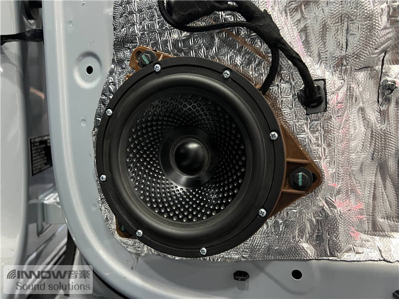 隔音完成后,技师将前声场喇叭升级成了德国彩虹 GL C6.2两分频喇叭,它的中低音单元使用的是铝纸复合振膜,让音乐在中低音部分更加饱满、动感;高音使用的是丝膜球顶设计,可以有效拉高整体声场,让音乐显得更加亮丽。后声场使用则是德国彩虹 SL Pro-C260两分频喇叭,充分保证了音乐味道的统一性。为了避免对汽车原有线路做过多改动,技师将中低音单元安装在了后门板原位,高音单元则安装在了门板饰盖上。