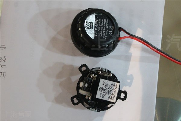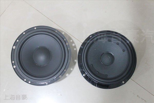 以色列摩雷听宝中低音单元(左)和帕萨特原车中低音对比,原车中低音用料比较简单,塑料纸盘结构,音响效果暗淡无光