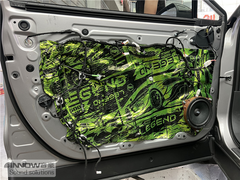 拆开汽车的门板饰盖以后可以看到,原车门板内部仅用了一层塑料薄膜做隔音处理,这很难起到良好的隔音效果。技师将劣质的隔音材料清除,使用俄罗斯StP 平衡卫士止震板对门板做止振处理,有效减少了门板处的噪声,为声场喇叭创造了一个良好的工作环境。