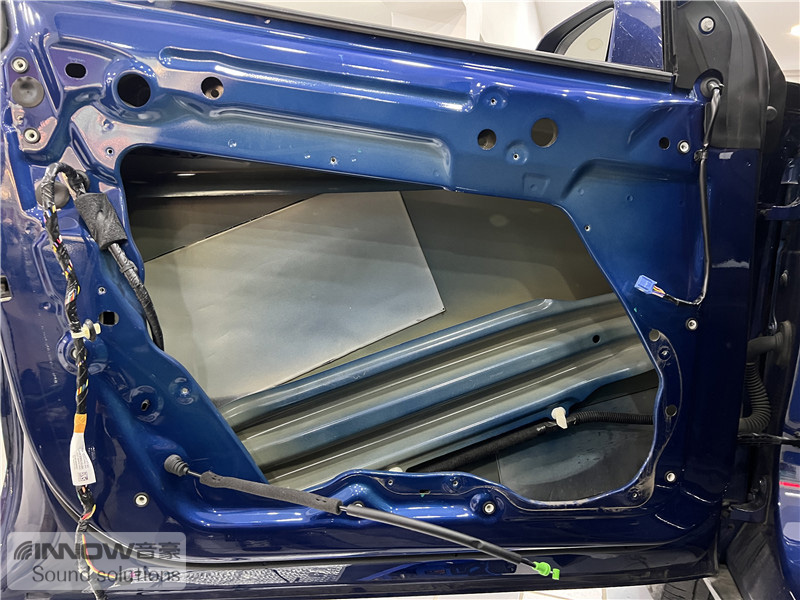 拆开汽车的门板饰盖以后可以看到,原车门板内部空洞结构很大,且未做有效隔音处理,风噪很容易通过门板传入到车厢内部,技师使用欧铂止震板对车门做车门做双层止振处理,让门板形成一个密封箱体,有效阻止风噪传入。
