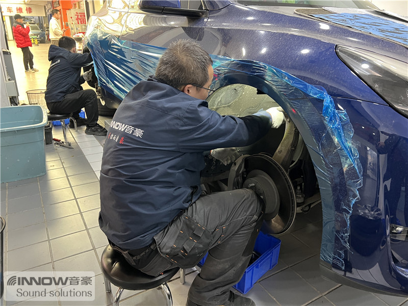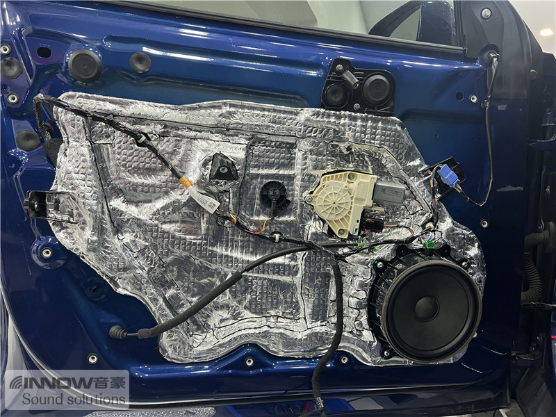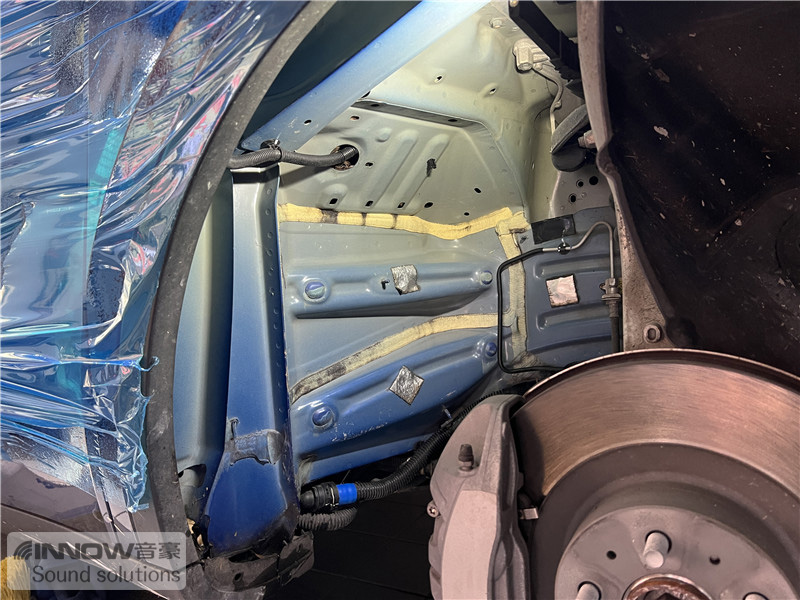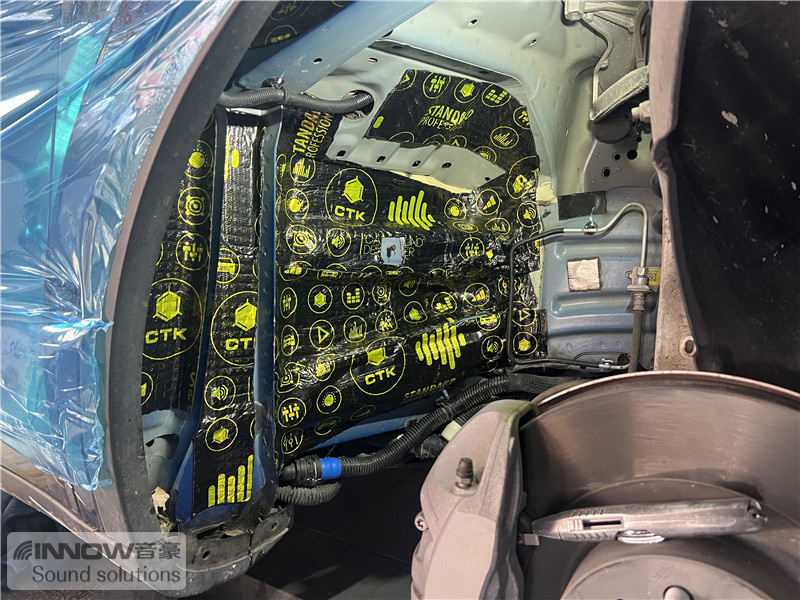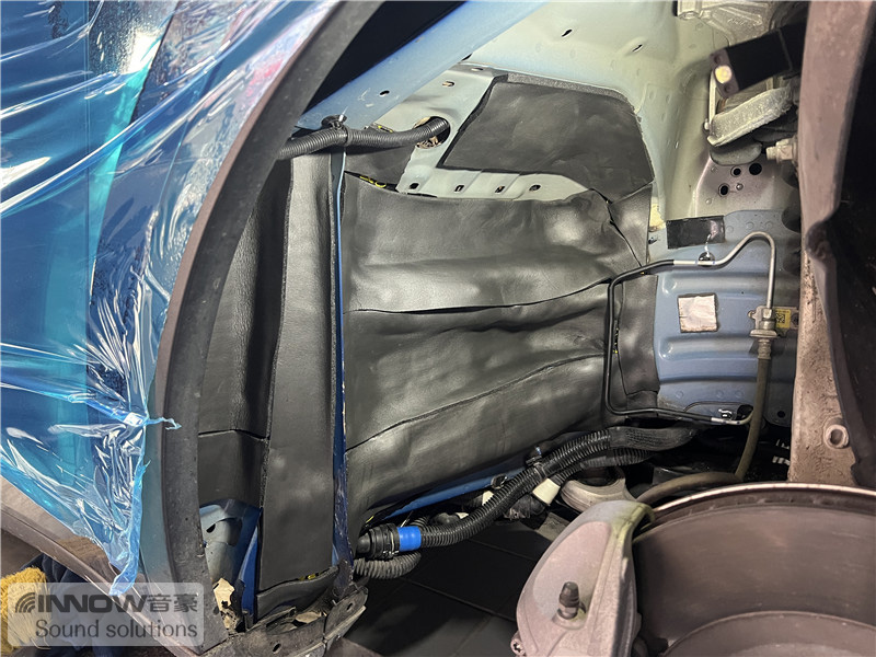 四轮翼子板是路噪和胎噪的主要传入路径,技师先使用欧标止震板对四轮翼子板做止振处理,以减少该部位钣金振动的产生;再使用弹力棉对四轮翼子板做吸音处理,这就切断了路噪和胎噪的传入路径,将此列噪声阻挡在了车厢之外。