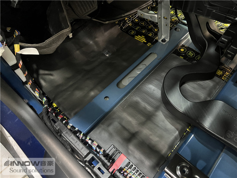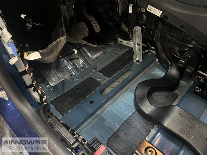 仪表台下方既会产生低频共振,也是前舱内各类噪声的主要传入路径之一。技师先使用欧标止震板对仪表台下方做止振处理,减少低频共振的产生;再使用弹力棉对仪表台下方做吸音处理;最后使用低频王隔音棉做隔音处理,既减少了该部位的低频共振,也阻止了前舱内各类噪声的传入。