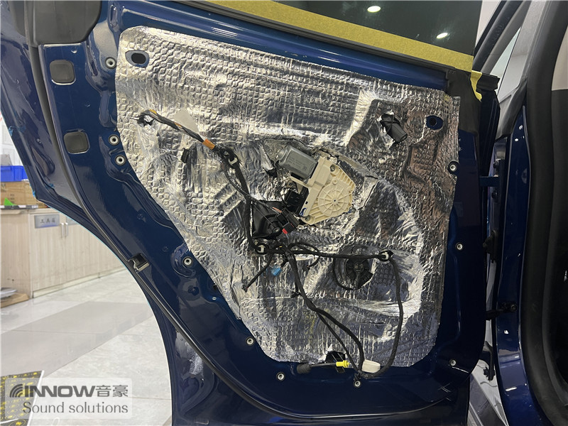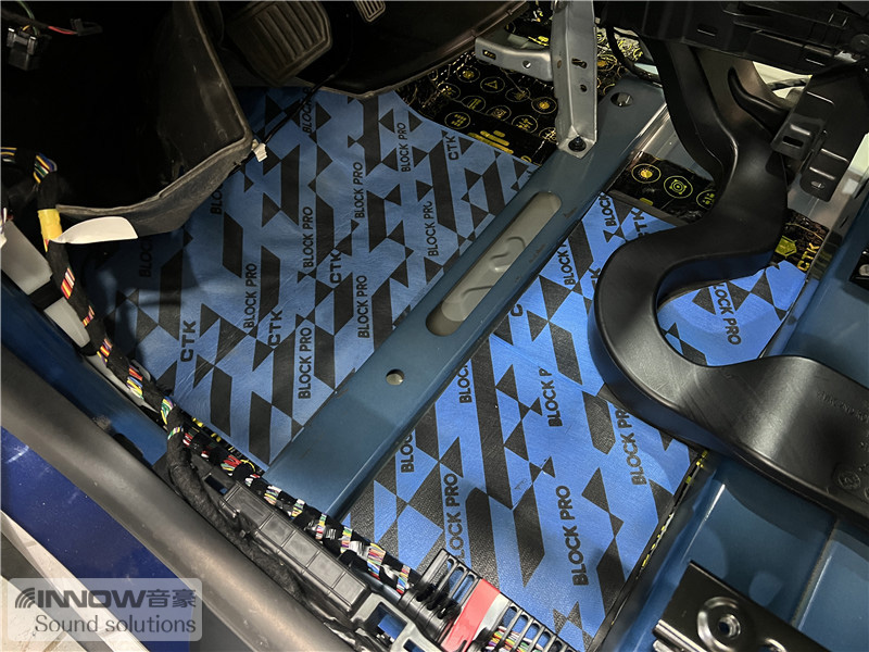 在对汽车做了道路实测后,技师发现原车的噪声主要为风噪、路噪、胎噪,以及来自发动机舱内的噪声几种,因此技师使用欧洲环保隔音CTK,对汽车的门板、四轮翼子板和仪表台下方,做了针对性的隔音处理。