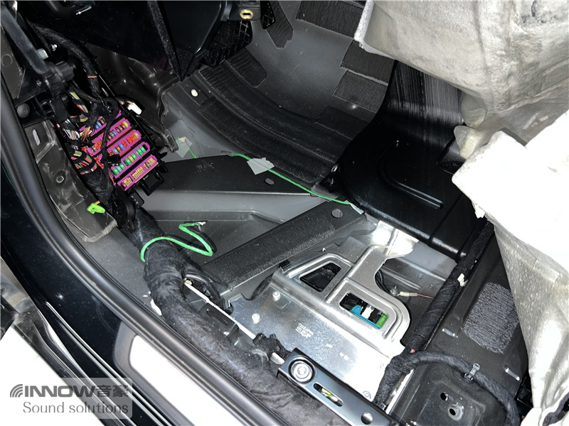 轮胎与地面摩擦会产生路噪和胎噪,此类噪声主要通过四轮翼子板传入到车厢内部。所以技师先使用欧尊止震板对四轮翼子板做了止振处理,这既可以减少空腔共鸣的产生,也可以增强该部位的密封性;再使用声学汉堡PRO对该部位做吸音处理,将路噪和胎噪进行吸收,这就切断了路噪和胎噪的传入路径,将此类噪声阻挡在了车厢之外。
