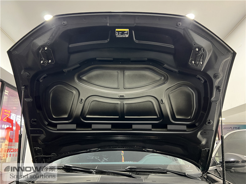 原车引擎盖只是一层铁皮结构,汽车行驶时引擎盖部位很容易产生振动噪声,所以技师先使用欧铂止震板对引擎盖做了止振处理,减少振动的产生;再使用银色棉对引擎盖做吸音处理,将噪声进行吸收,进一步提升隔音的效果。