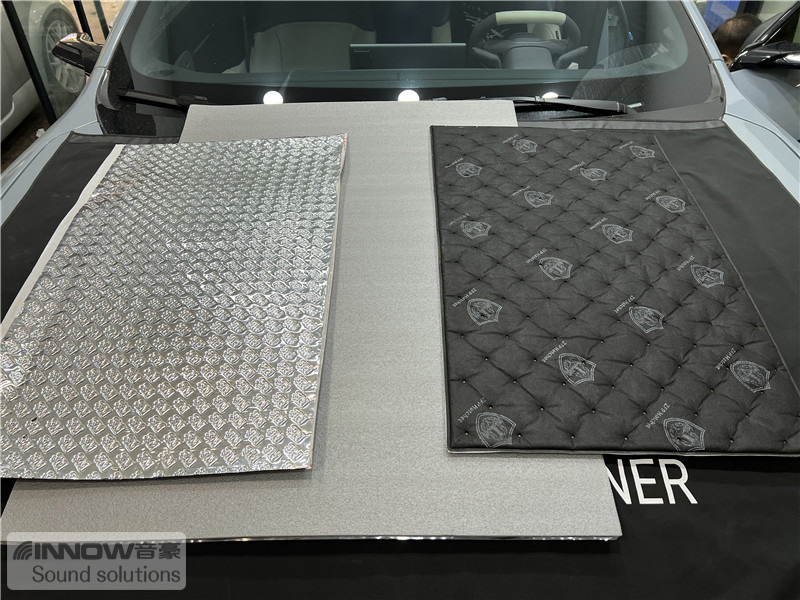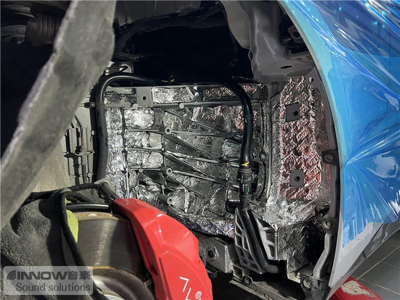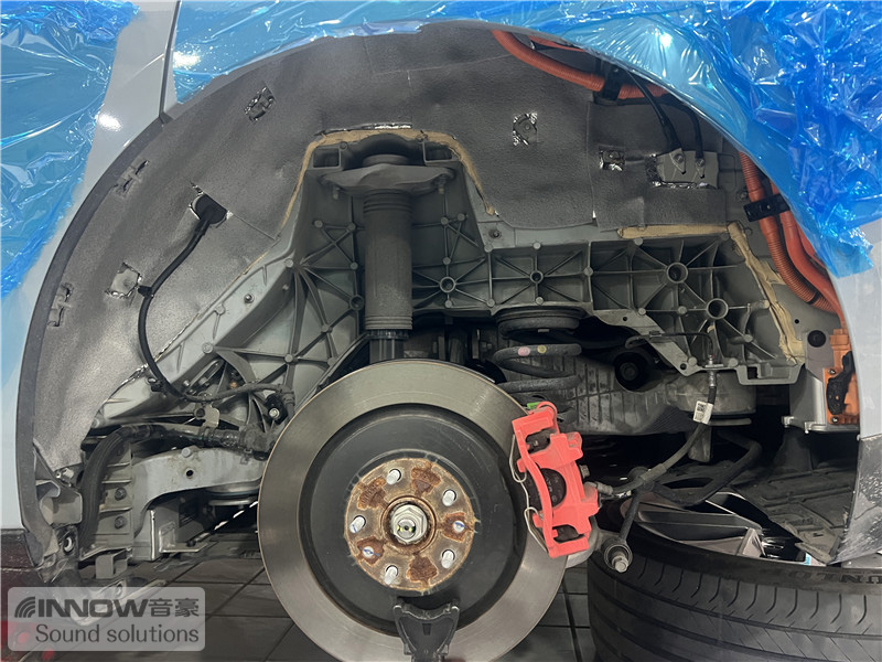 轮胎与地面摩擦会产生路噪和胎噪,此类噪声主要通过四轮翼子板传入到车厢内部。技师先使用欧铂止震板对四轮翼子板做止振处理,减少钣金振动的产生;再使用smart棉做隔音处理,增强该部位的密封性;而翼子板内衬,技师则使用战斧棉做吸音处理,多层的施工,阻止了大部分路噪和胎噪的传入。