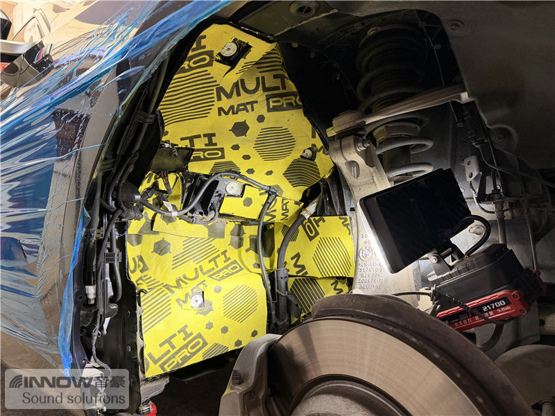 经过检测,技师发现原车的噪声主要为路噪和胎噪,这种类型的噪声会随着车速的提高而变得越来越大,因此技师使用欧洲环保隔音CTK,对汽车的四轮翼子板,做了针对性的隔音处理。