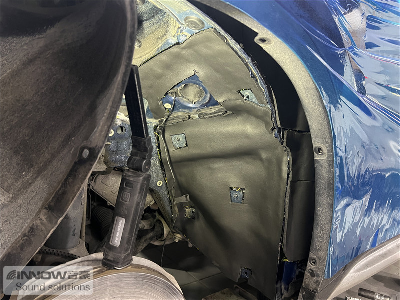 轮胎与地面摩擦难免会产生路噪和胎噪,此类噪声主要通过四轮翼子板传入到车厢内部。技师先使用欧标止震板对四轮翼子板做止振处理,减少钣金振动的产生;再使用弹力棉对该部位做吸音处理;最后使用低频王隔音棉做隔音处理,这就切断了路噪和胎噪的传入路径,将此类噪声阻挡在了车厢之外。