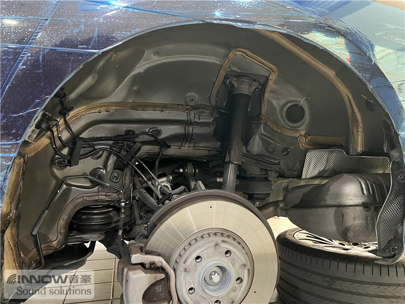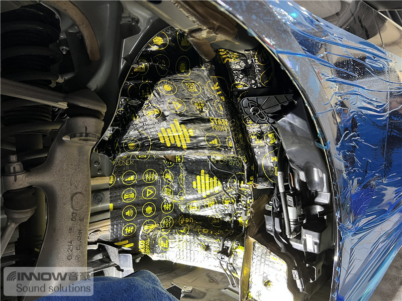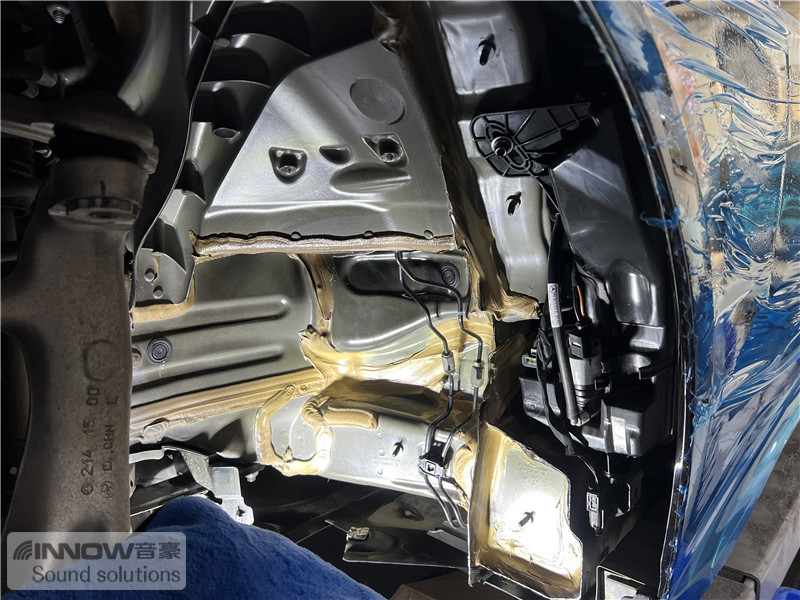 经过道路实测,技师发现原车的噪声主要有两类,第一类是路噪和胎噪;第二类则是引擎盖部位的噪声,因此技师使用 欧洲环保隔音CTK,对四轮翼子板和引擎盖,做了针对性的隔音处理。