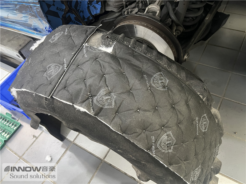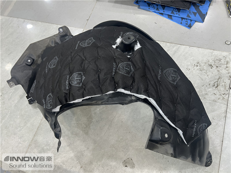 轮胎与地面摩擦会产生路噪和胎噪,此类噪声主要通过四轮翼子板传入到车厢内部。技师先使用欧标止震板对四轮翼子板做止振处理,减少钣金振动的产生;再使用低频王做隔音处理,增强该部位的密封性;在此基础上使用弹力棉做吸音处理,将噪声进一步吸收。而拆卸下来的叶子板内衬,技师则使用战斧隔音棉对其做了吸音处理,多层的施工,阻止了大部分路噪和胎噪的传入。