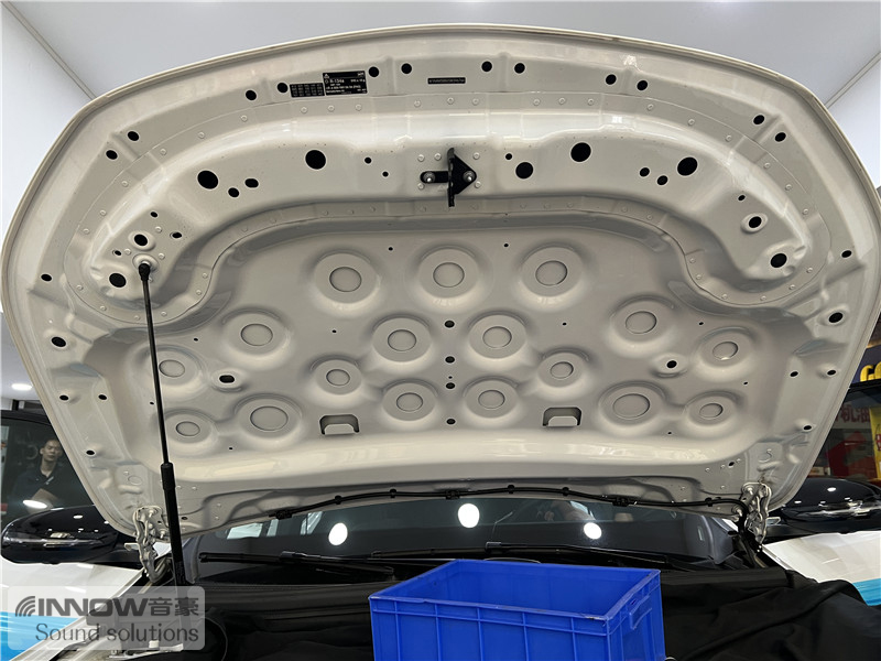 原车引擎盖只是一层铁皮结构,汽车行驶时引擎盖部位很容易产生振动噪声。所以技师先使用欧铂止震板对引擎盖做止振处理;再使用银色棉对引擎盖做吸音处理,进一步提升降噪的效果。