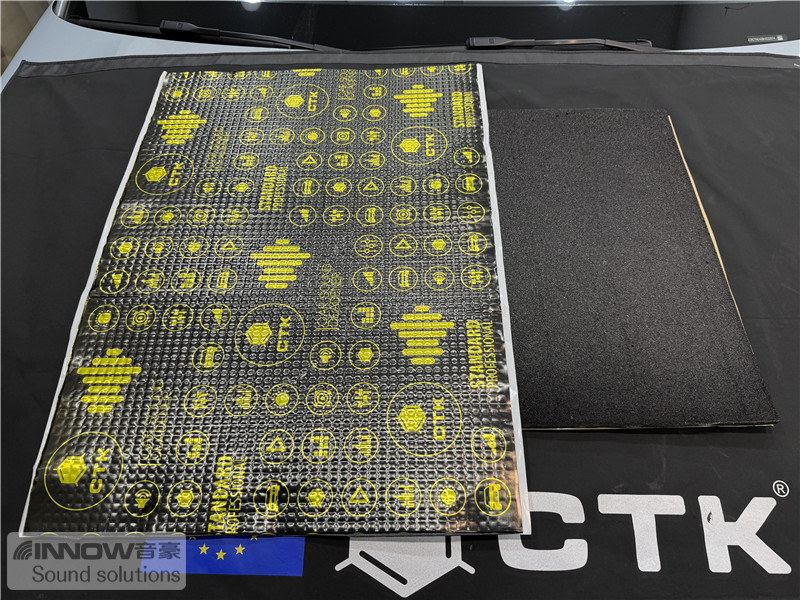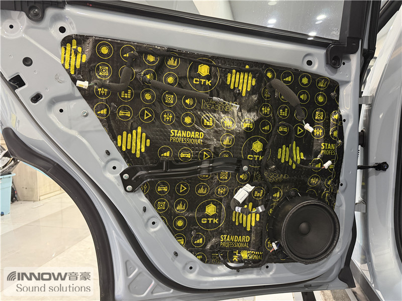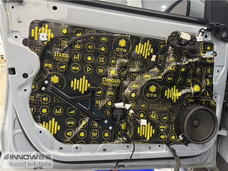 经过检测,技师发现原车的噪声主要有两大类,第一类是风噪;第二类是路噪和胎噪。这两类噪声在高速行驶时会更加明显。因此技师使用欧洲环保隔音CTK,对门板和四轮翼子板,做了针对性的隔音处理。