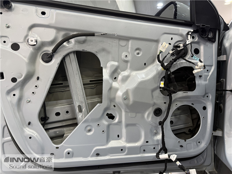 拆开汽车的门板饰盖以后,可以看到门板内部空洞结构很多,且未做有效隔音处理,风噪很容易通过门板传入到车厢内部,技师使用欧标止震板对门板做双层止振处理,让门板形成一个密封箱体,有效阻止风噪传入。
