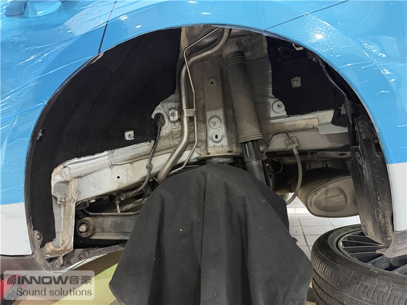 汽车行驶时产生的路噪和胎噪,主要通过四轮翼子板传入到车厢内部,技师先使用欧标止震板对四轮翼子板做止振处理,减少该部位钣金振动的产生;再使用黑色线性棉做吸音处理。而翼子板内衬,技师则使用战斧隔音棉做吸音处理,多层的施工,有效阻止了路噪和胎噪的传入。