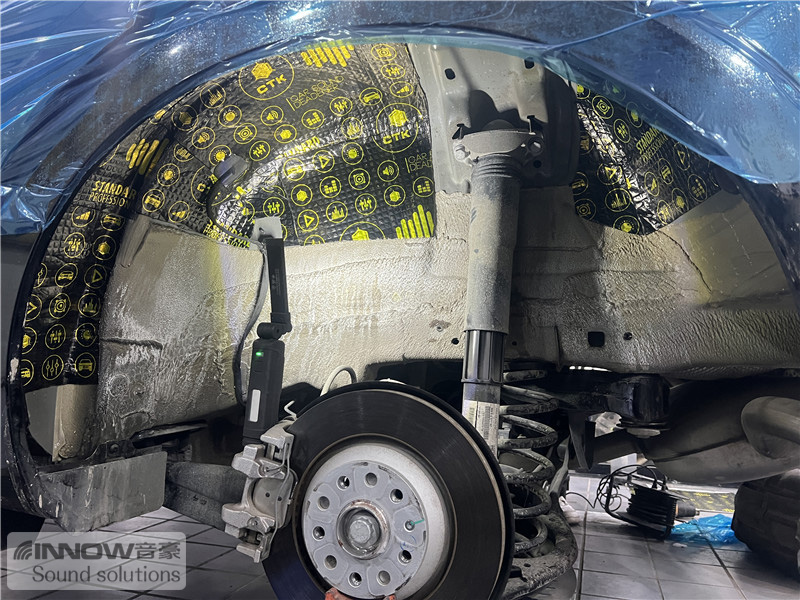 经过道路实测,技师发现原车的噪声主要有两种,第一种是来自发动机舱内的噪声;第二种是路噪和胎噪,因此技师使用欧洲环保隔音CTK,对引擎盖、仪表台下方和前轮翼子板,做了针对性的给隔音处理。