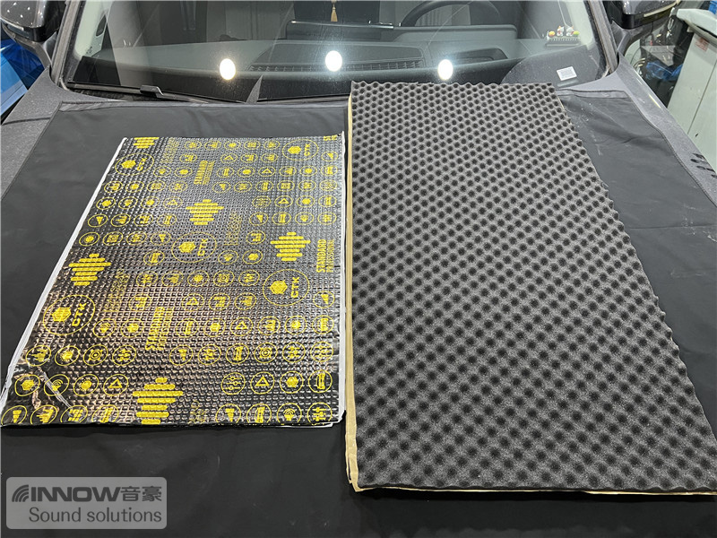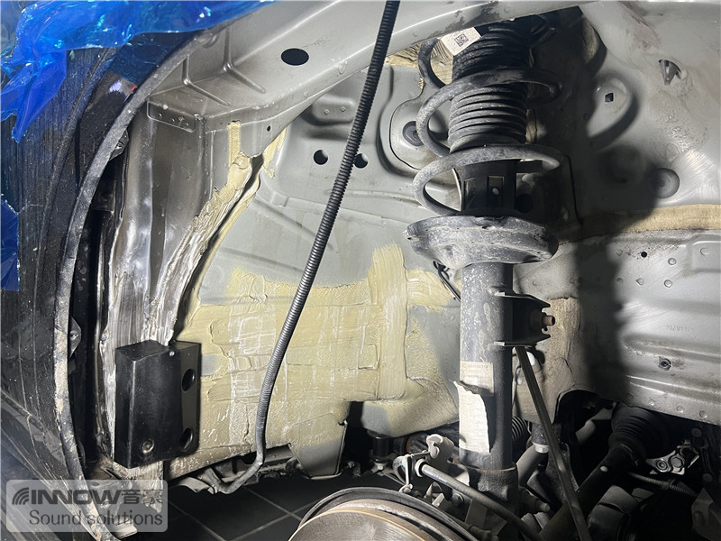 轮胎与地面摩擦会产生路噪和胎噪,这些噪声会通过四轮翼子板传入到车厢内部。技师先使用欧标止震板对四轮翼子板做止振处理,以减少该部位钣金振动的产生;再使用波浪棉对四轮翼子板做吸音处理,将路噪和胎噪进行吸收,双层的施工,阻止了大部分路噪和胎噪的传入。