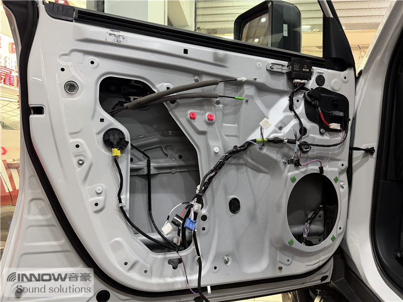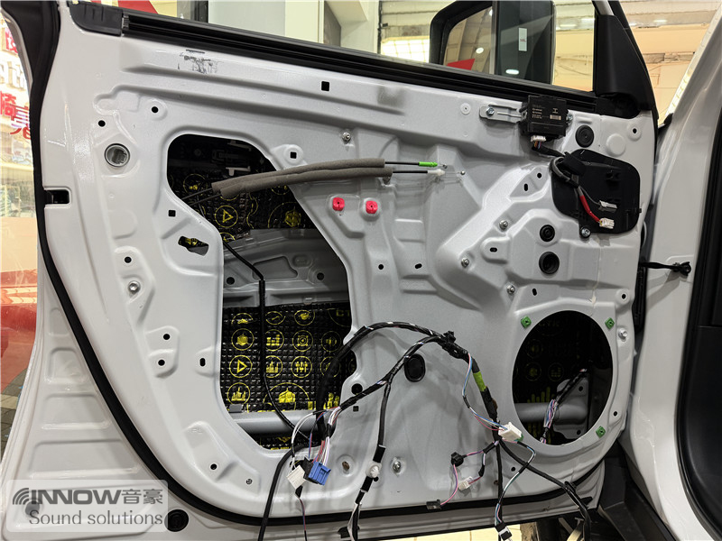 原车门板铁皮结构很厚实,但是拆开门板饰盖以后可以看到原车门板内部空洞结构很多,且未做有效隔音处理。技师使用欧标止震板对门板做双层止振处理,在减少门板自身钣金振动的同时,也增强了门板处的密封性,有效阻止了风噪的传入。