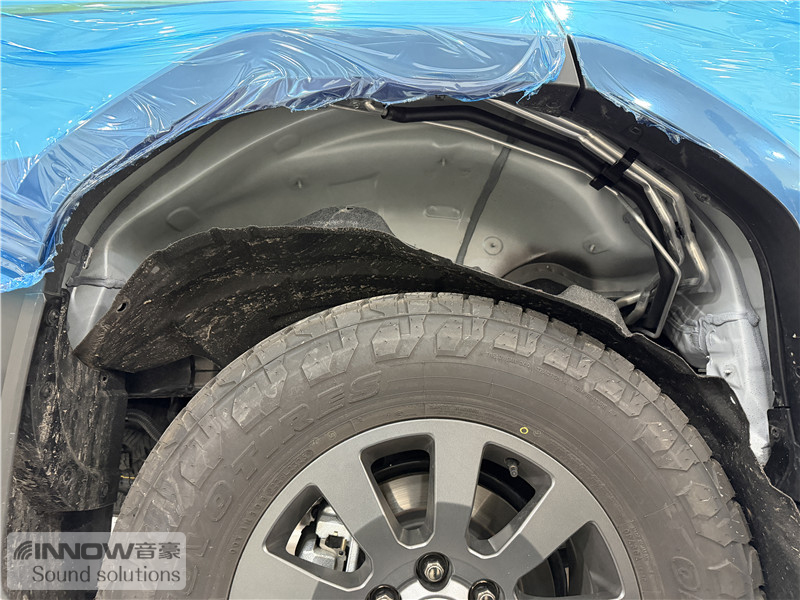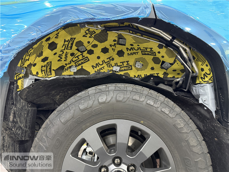 轮胎与地面摩擦会产生路噪和胎噪,此类噪声主要通过四轮翼子板传入到车厢内部。技师先使用欧标止震板对四轮翼子板做止振处理,减少该部位的振动噪声;再使用声学汉堡5.5对四轮翼子板做隔音处理,增强该部位的密封性,双层的隔音处理,阻止了大部分路噪和胎噪的传入。