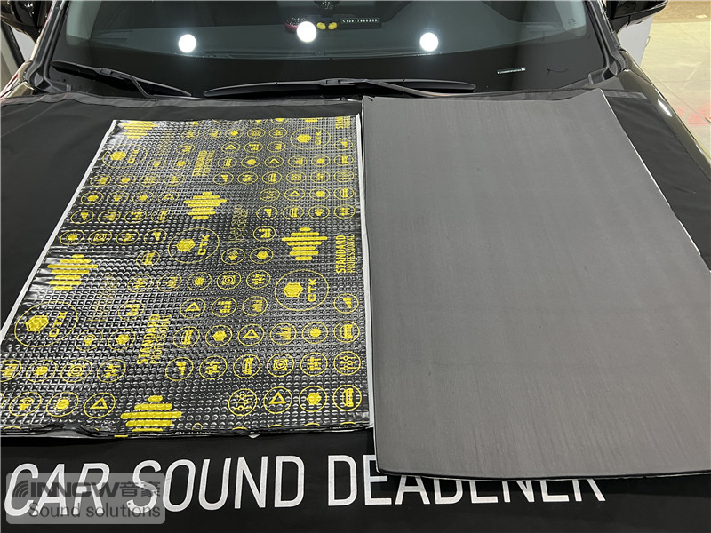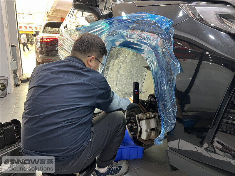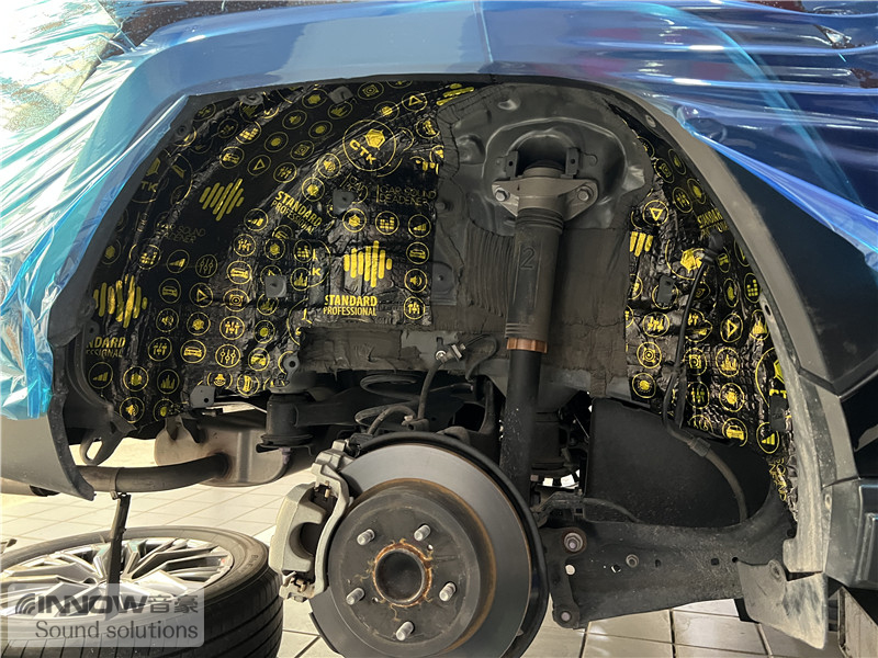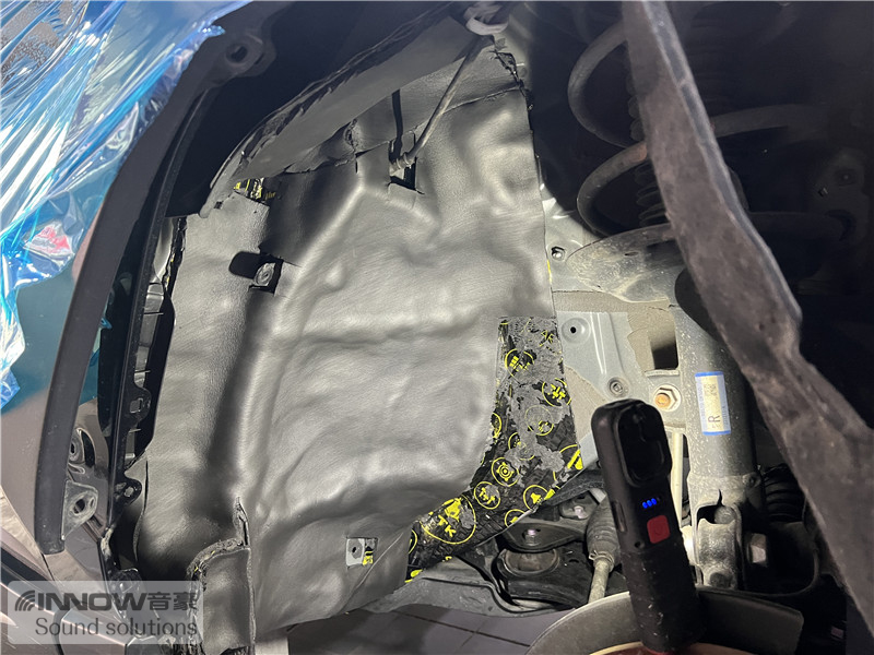 汽车行驶时会产生路噪和胎噪,此类噪声主要通过四轮翼子板传入到车厢内部。技师先使用欧标止震板对四轮翼子板做止振处理,它的丁基胶部位采用了更好的物料,铝箔厚度也做到了100μm,可以很好的减少翼子板处的钣金振动;在此基础上使用弹力棉做吸音处理,将路噪和胎噪进行吸收,充分保证隔音的效果。
