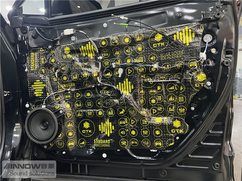 经过检测,技师发现原车在低速行驶时车厢内噪声还不是很明显,但随着车速的提高,风噪、路噪和胎噪也会随之而增大,因此技师使用 欧洲环保隔音CTK,对汽车的门板和四轮翼子板,做了针对性的隔音处理。