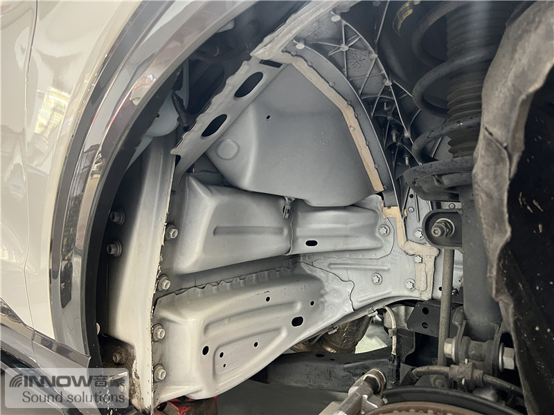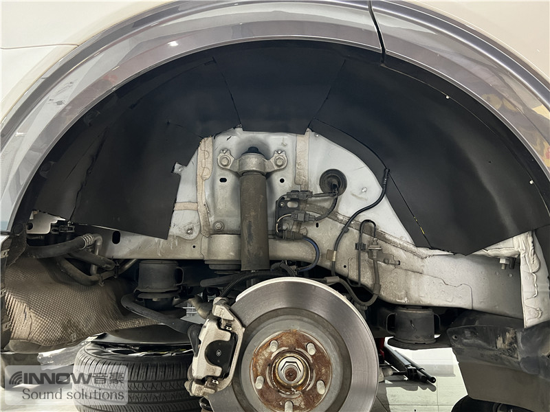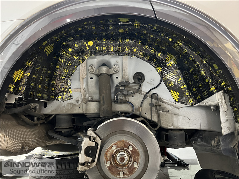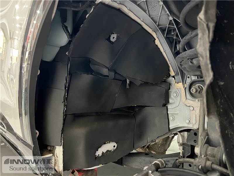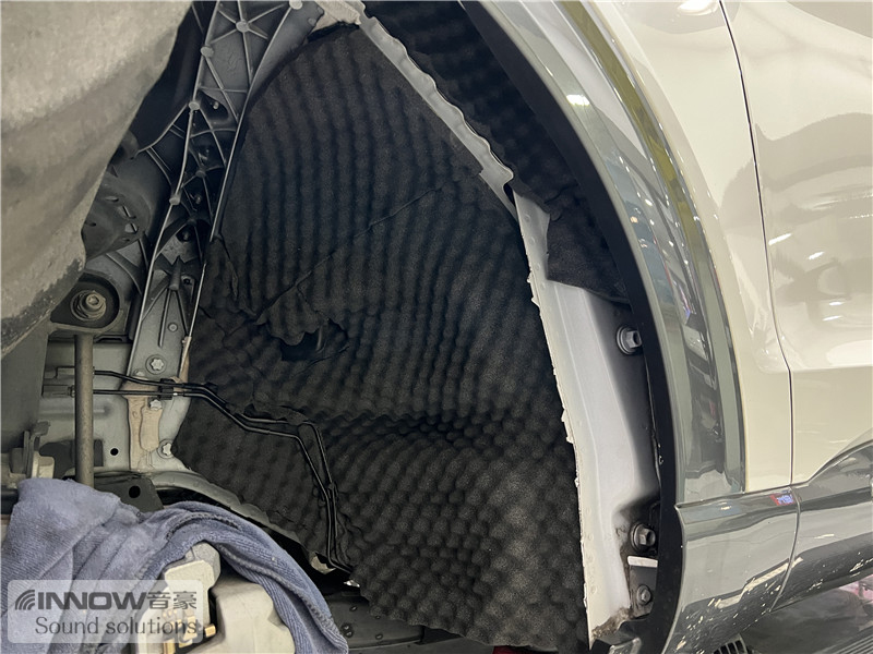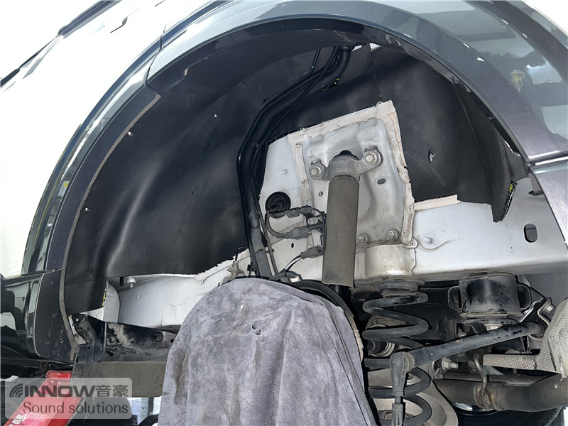 轮胎与地面摩擦会产生路噪和胎噪,此类噪声主要通过四轮翼子板传入到车厢内部。技师先使用欧标止震板对四轮翼子板做止振处理,减少钣金振动的产生;再使用弹力棉做隔音处理,增强该部位的密封性;最后使用防水吸音棉做吸音处理,将路噪和胎噪进一步吸收,让隔音效果更加理想。