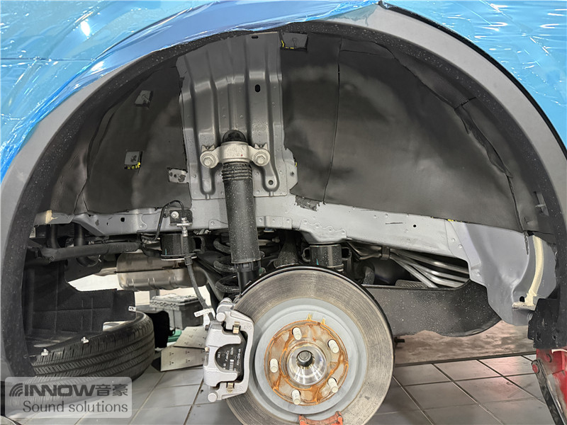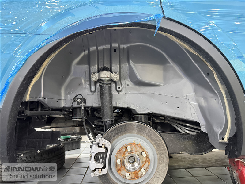 原车翼子板处未做任何有效隔音处理,导致路噪和胎噪可以轻松传入到车厢内部。技师先使用欧标止震板对四轮翼子板做止振处理,减少该部位钣金振动的产生;再使用弹力棉对四轮翼子板做吸音处理,将路噪和胎噪进行吸收,充分保证隔音的效果。
