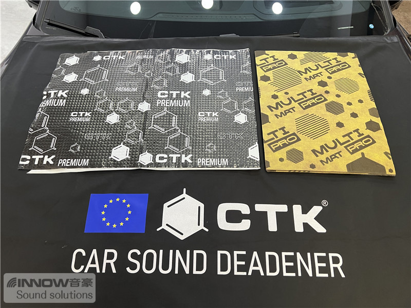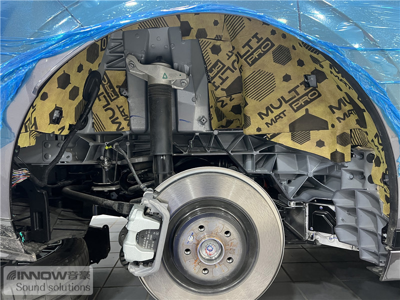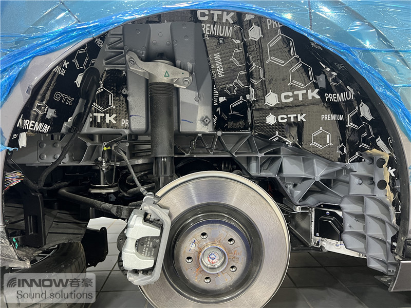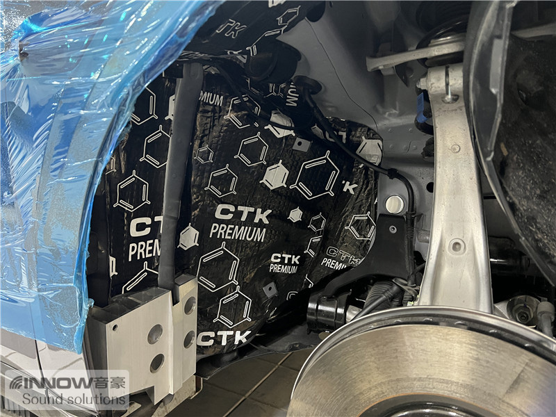经过道路测试,技师发现原车的噪声主要以路噪和胎噪,在高速行驶时这种噪声会更加的明显。因此技师使用欧洲环保隔音CTK,对汽车的四轮翼子板做了针对性的隔音处理。
