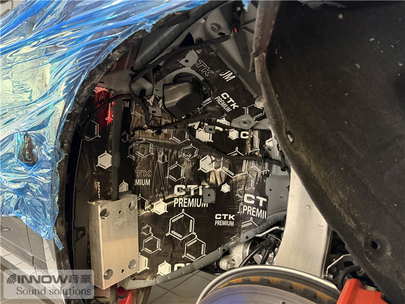 经过检测,技师发现原车的噪声主要为路噪和胎噪,这类噪声在高速行驶时尤为明显,因此技师使用欧洲环保隔音CTK,对汽车的四轮翼子板,做了针对性的隔音处理。