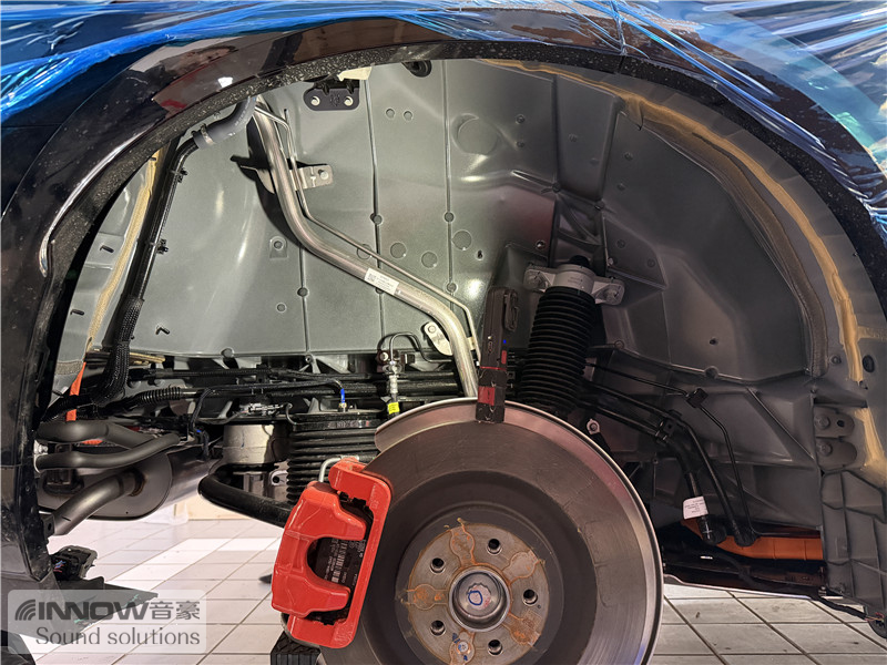 轮胎与地面摩擦会产生路噪和胎噪,此类噪声主要通过四轮翼子板传入到车厢内部。技师先使用欧尊止震板对四轮翼子板做止振处理,减少钣金振动的产生;再使用声学汉堡5.5对该部位做隔音处理。双层的隔音处理,将路噪和胎噪阻挡在了车厢之外。