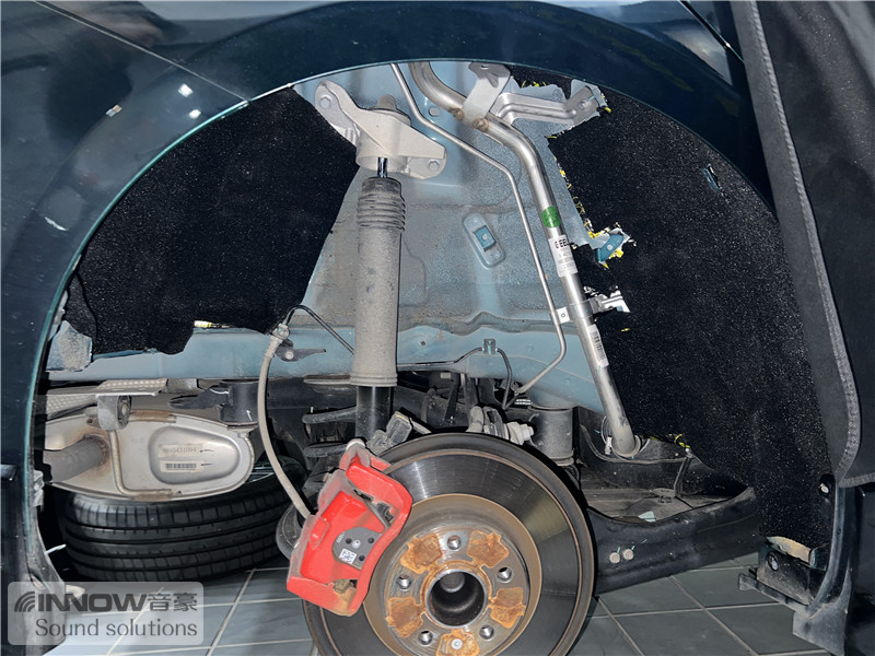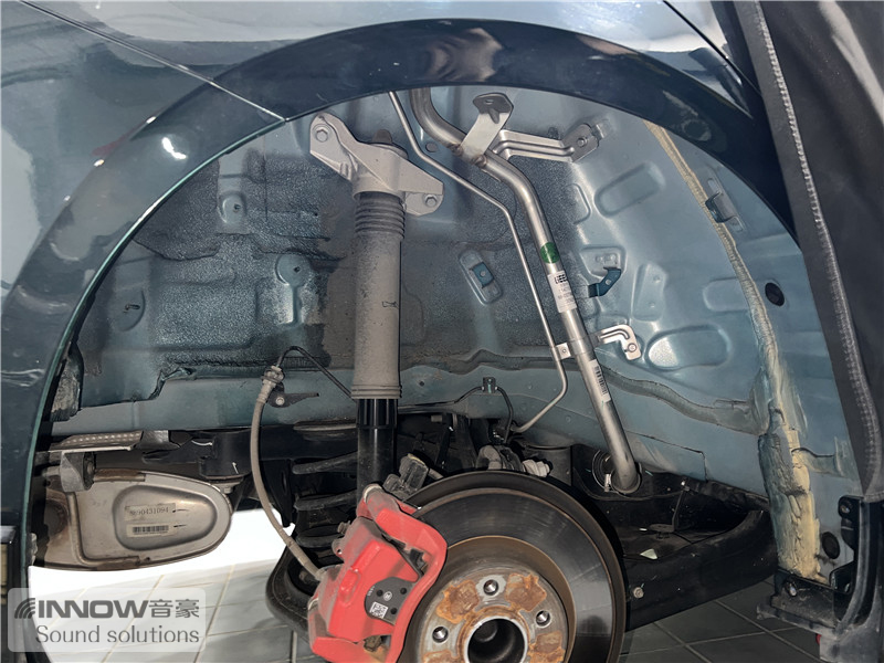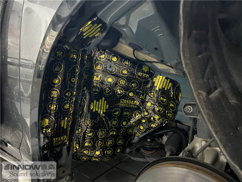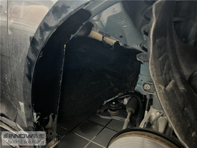轮胎与地面摩擦会产生路噪和胎噪,此类噪声会通过四轮翼子板传入到车厢内部。技师先使用欧标止震板对四轮翼子板做止振处理,减少钣金振动的产生,并增强翼子板处的密封性;再使用线性棉对四轮翼子板做吸音处理,将路噪和胎噪进行吸收,让隔音效果更加理想。