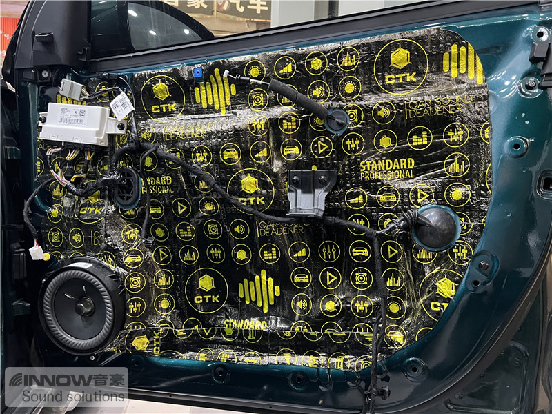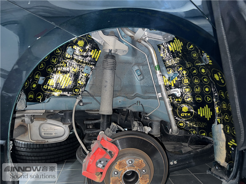 经过道路实测,技师发现原车噪声主要有两种,第一种是风噪,第二种是路噪和胎噪,因此技师使用欧洲环保隔音CTK,对汽车的门板和四轮翼子板等部位,做了针对性的隔音处理。