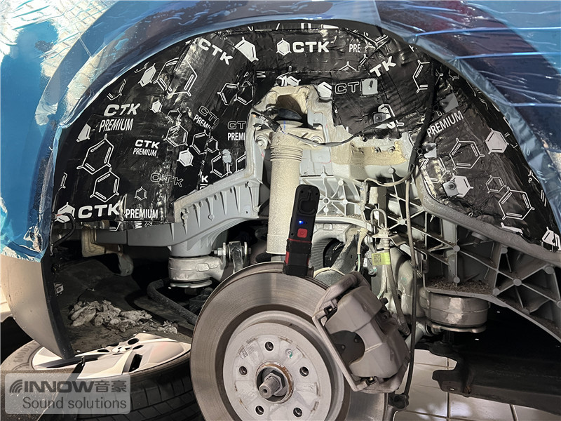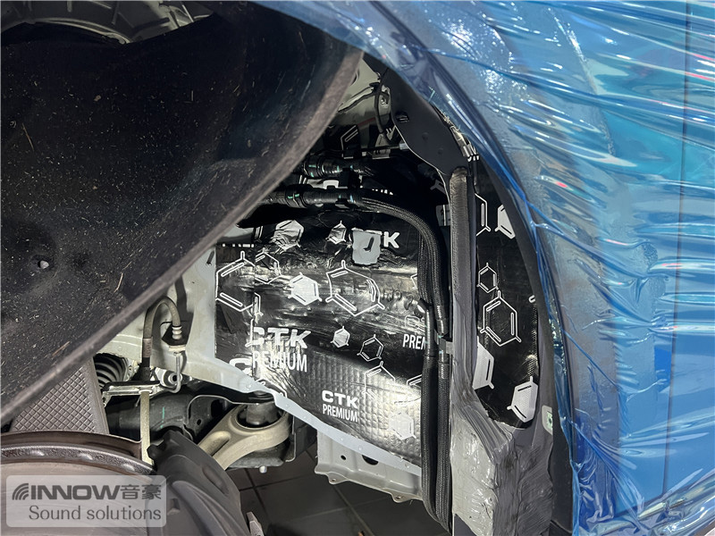 经过道路测试,技师发现原车的噪声主要为路噪和胎噪,这类噪声也是汽车行驶过程当中非常常见的一种噪声,因此技师使用欧洲环保隔音CTK,对汽车的四轮翼子板,做了针对性的隔音处理。