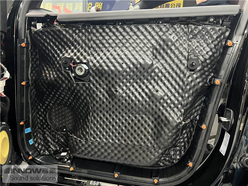原车门板还算厚实,但是门板内部空洞结构较大,且未做有效隔音处理,风噪很容易通过门板传入到车厢内部,技师使用欧标止震板对门板做双层止振处理,而门板饰盖则使用波浪吸音棉做吸音处理,这就增强了门板处的密封性,阻止了风噪的传入。
