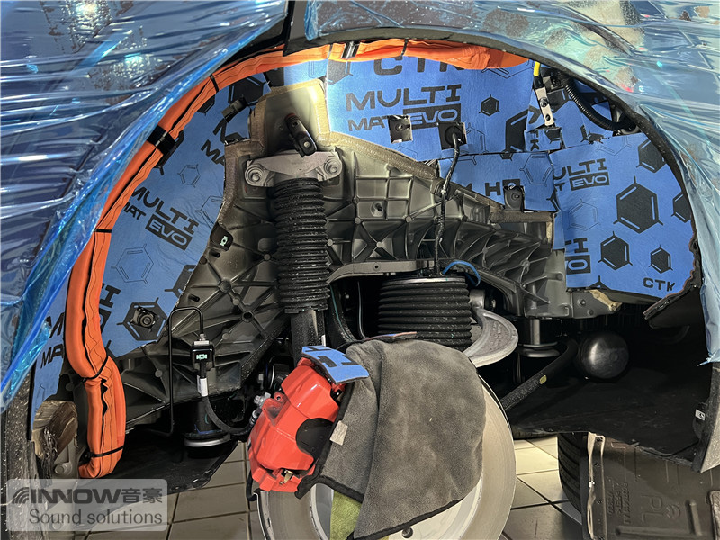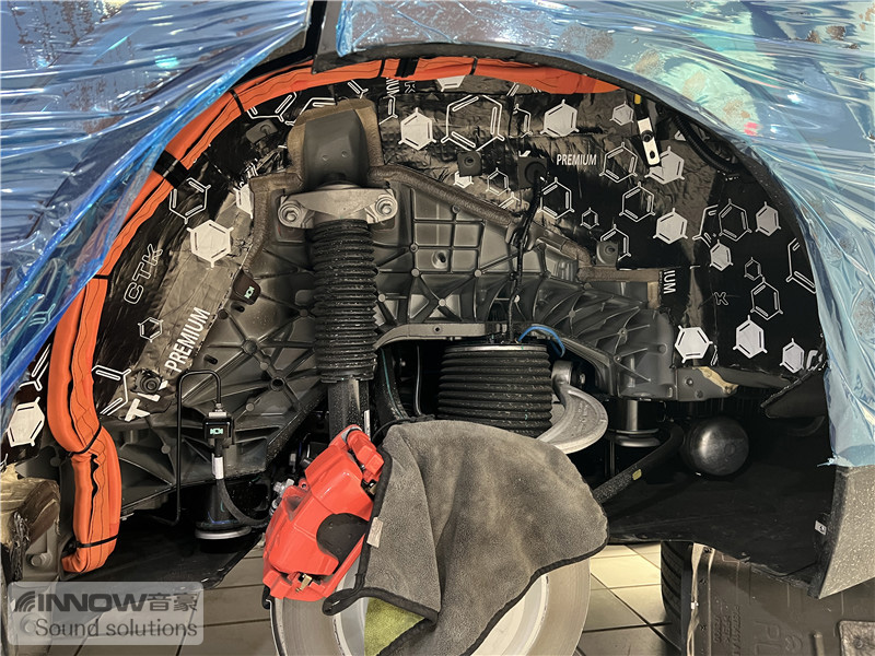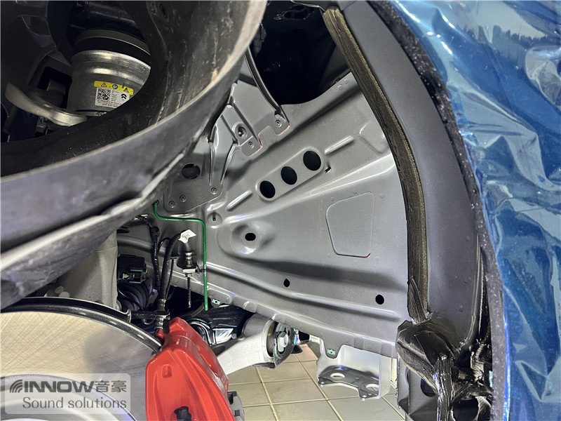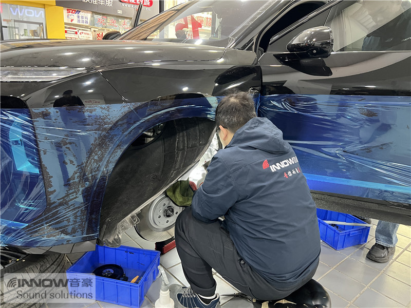 汽车行驶时会产生路噪和胎噪,此类噪声主要通过四轮翼子板传入到车厢内部。技师先使用欧尊止震板对四轮翼子板做止振处理,减少钣金振动的产生;在此基础上再使用声学汉堡7.5做隔音处理,从而将路噪和胎噪阻挡在了车厢之外。