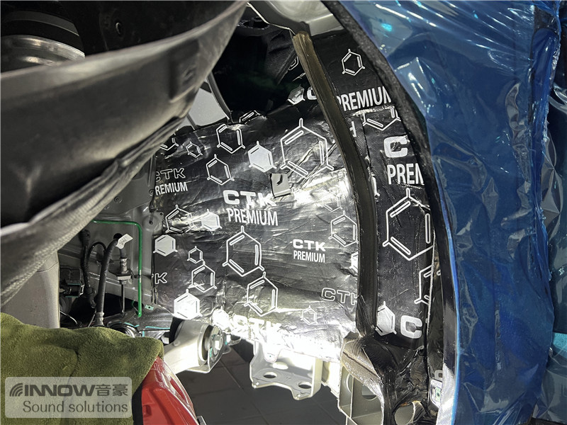 经过检测,技师发现原车的噪声主要有两种,第一种是风噪;第二种是路噪和胎噪,因此技师使用欧洲环保隔音CTK,对汽车的门板和四轮翼子板等部位,做了针对性的隔音处理。