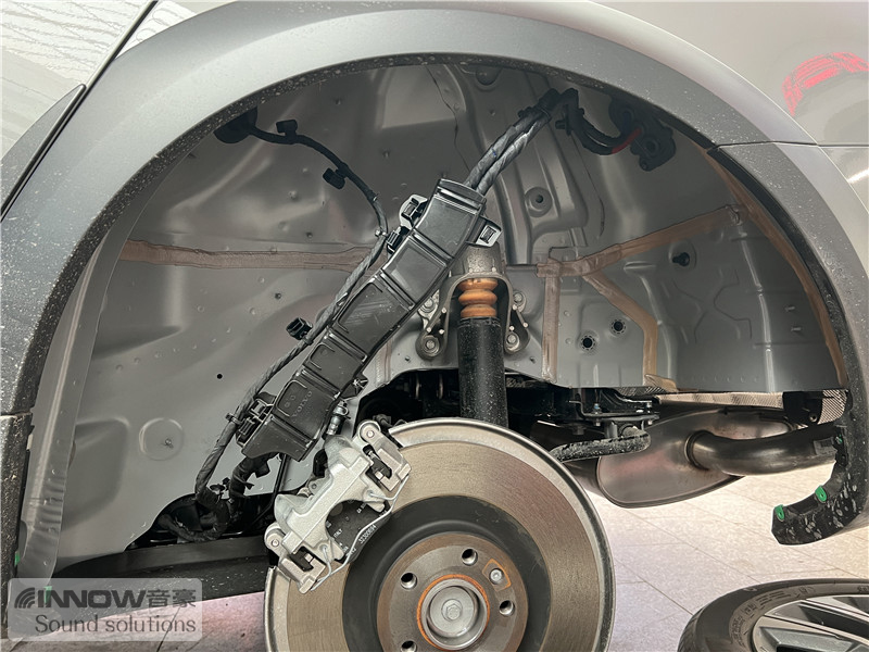 技师拆下原车翼子板内衬后发现,翼子板处没有做任何隔音措施,轮胎与地面摩擦产生的路噪和胎噪,很容易通过该部位传入到车厢内部。因此技师先使用欧标止震板对四轮翼子板做止振处理,减少该部位的钣金共振;再使用线性棉对四轮翼子板做吸音处理,从而阻止了大部分路噪和胎噪的传入。