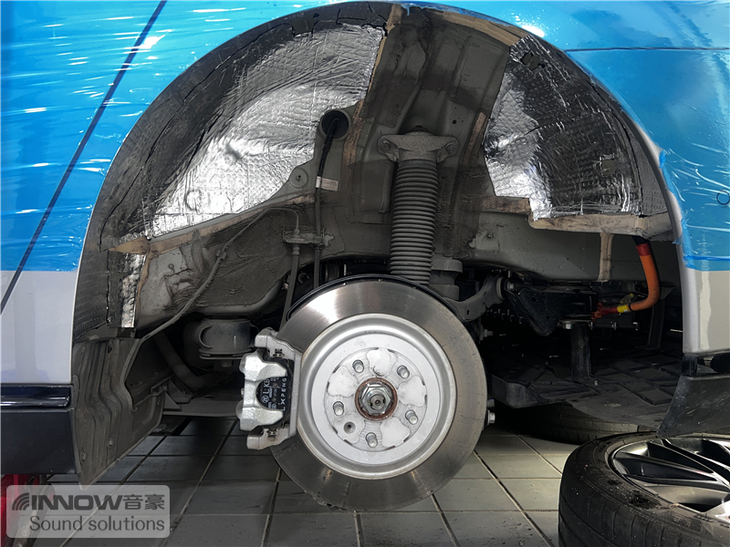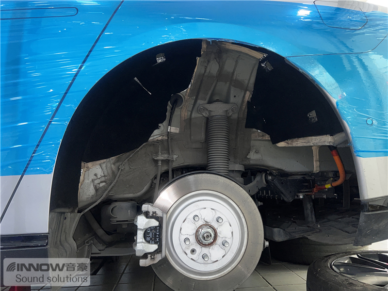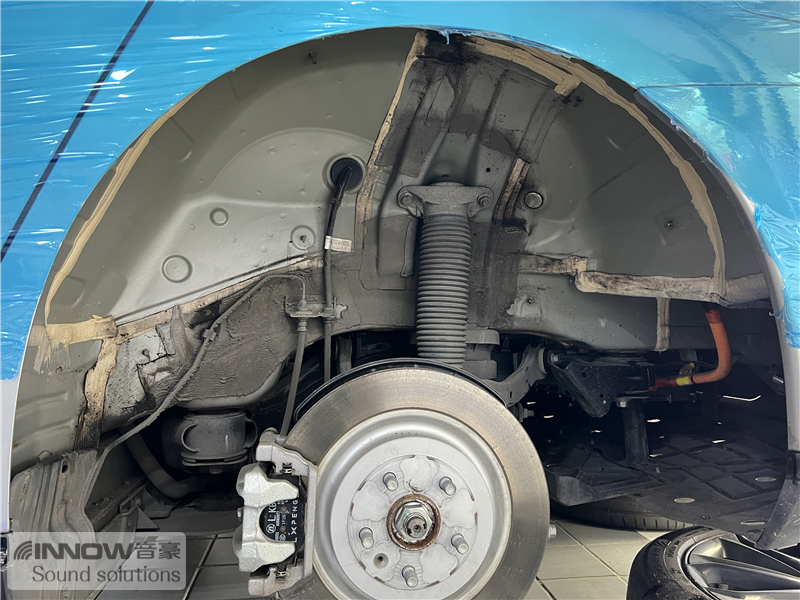 经过检测,技师发现原车的噪声主要为路噪和胎噪,这类噪声会随着车速的提升而变得越来越大。因此技师使用欧洲环保隔音CTK,对汽车的四轮翼子板,做了针对性的隔音处理。