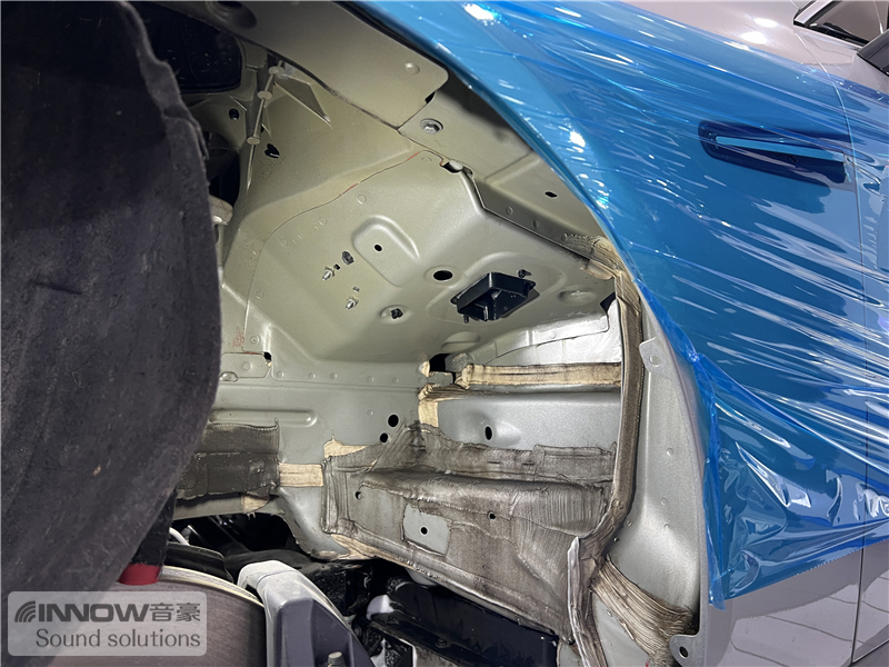 汽车行驶时难免产生路噪和胎噪,此类噪声主要通过四轮翼子板传入到车厢内部。技师先使用欧铂止震板对四轮翼子板做止振处理,在减少钣金振动的同时也增强了翼子板处的密封性;再使用黑色线性棉做吸音处理,将路噪和胎噪进行吸收,进一步提升隔音的效果。