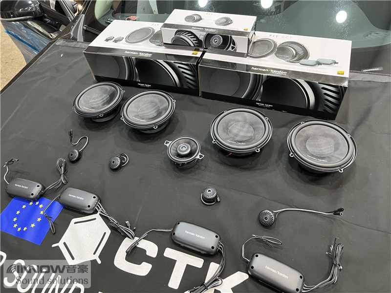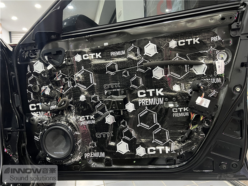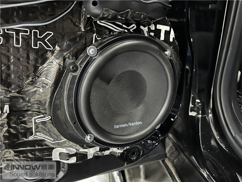 在使用欧洲环保隔音CTK 欧尊止震板,对门板做了隔音处理后,技师将前声场喇叭升级成了哈曼卡顿 FIT 6CF两分频喇叭,它的高音单元使用的是柔丝球顶高音,并采用了边缘驱动,让高频部分显得更加平滑;中低音单元使用了大音圈设计,让中低音部分更加真实饱满。