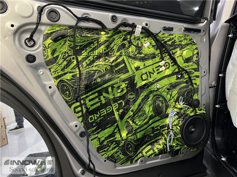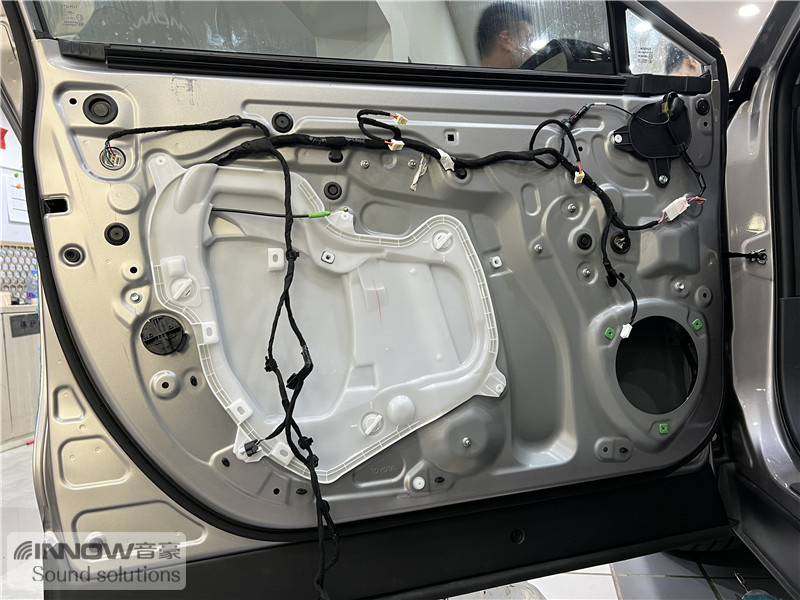 拆开汽车的门板饰盖以后可以看到,原车门板内部仅用了一层塑料薄膜做隔音处理,这很难起到良好的隔音效果。技师将劣质的隔音材料清除,使用俄罗斯StP 平衡卫士止震板对门板做止振处理,有效减少了门板处的噪声,为声场喇叭创造了一个良好的工作环境。