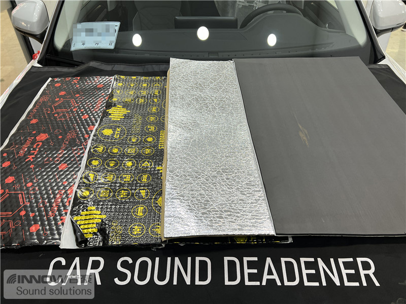 原车引擎盖只是一层铁皮结构,汽车行驶时引擎盖部位不仅容易产生振动噪声,发动机工作产生的热量也会加速引擎盖漆面的老化速度。所以技师在使用欧标止震板对引擎盖做了止振处理后,又使用银色机盖棉对引擎盖做了隔热处理,起到了保护引擎盖漆面的目的。