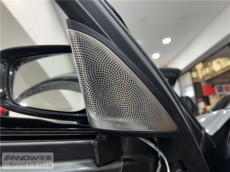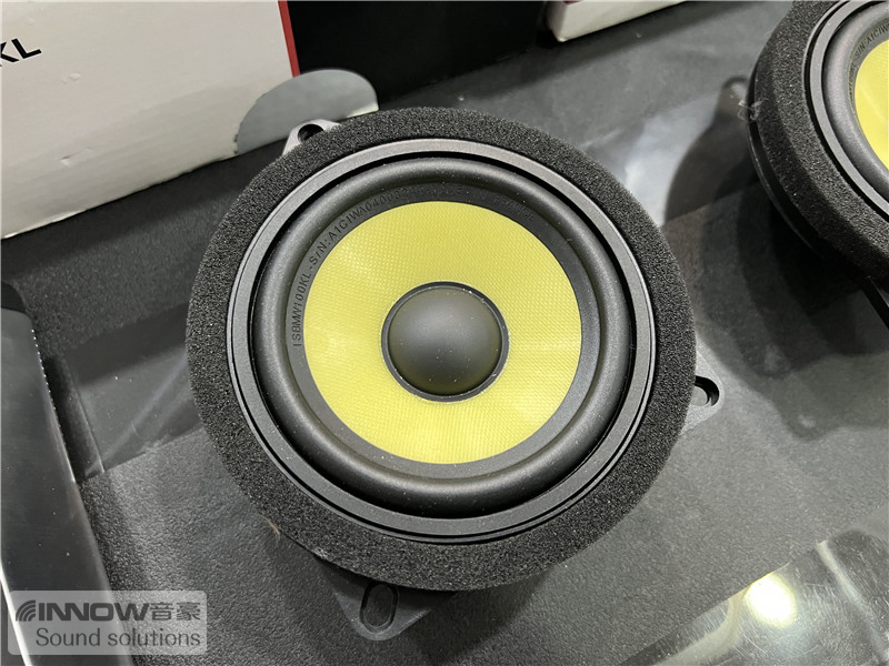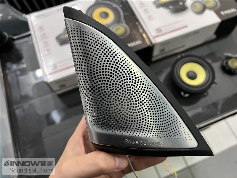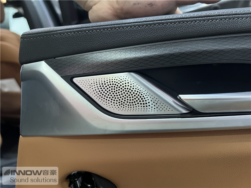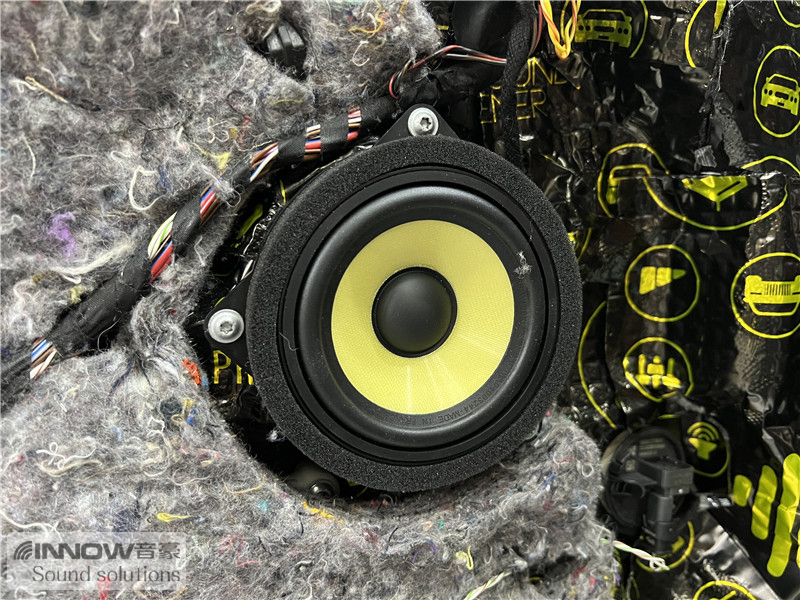 由于设计等原因,原车前声场并无高音单元,这会导致汽车播放出来的音乐非常沉闷,因此技师将前声场升级成了法国劲浪100KL 宝马专用中高音,高音单元可以弥补原车在高频部分的缺失,让音乐显得更加细腻亮丽。而且将其安装在门板三角位处也非常合适,不会对汽车原有线路做任何改动。而中音单元的升级,则可以让音乐显得更加醇厚饱满。