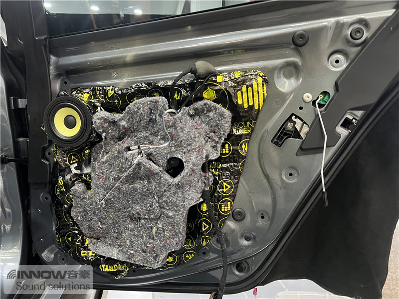 汽车行驶时门板处会产生噪声,而这些噪声会对音响品质产生非常大的影响,技师使用CTK欧标止震板对门板做止振处理,减少门板处的噪声,为声场喇叭创造一个良好的工作环境。