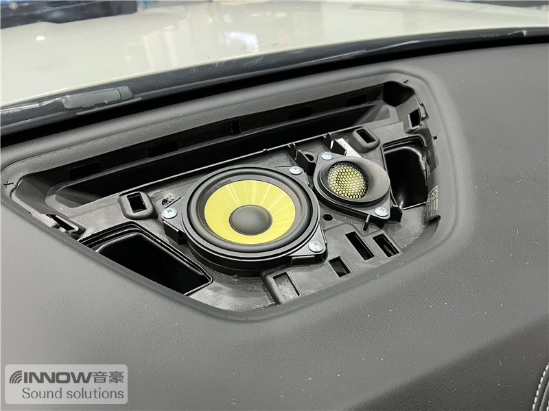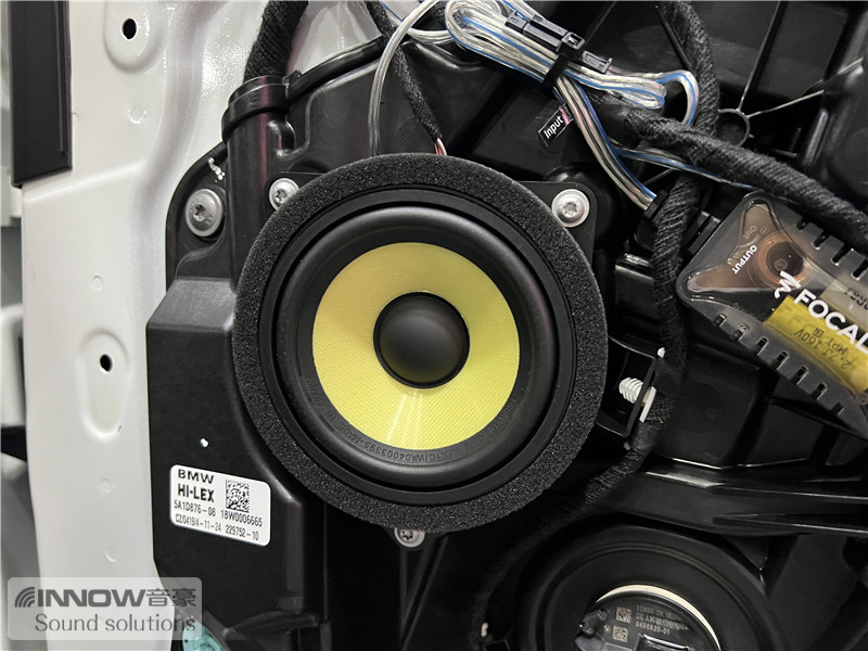前声场使用的是法国劲浪 宝马专用中高音,这套喇叭的中音单元使用了三明治复合音盆,并使用了超厚悬边进行保护,让音乐的中频部分更加丰富饱满;高音使用的是M型倒穹顶防弹纤维音盆,让高音部分更加宽阔、通透。为了避免对汽车原有线路做过多改动,技师将中音单元安装在了门板原位,高音单元则安装在了门板把手附近。