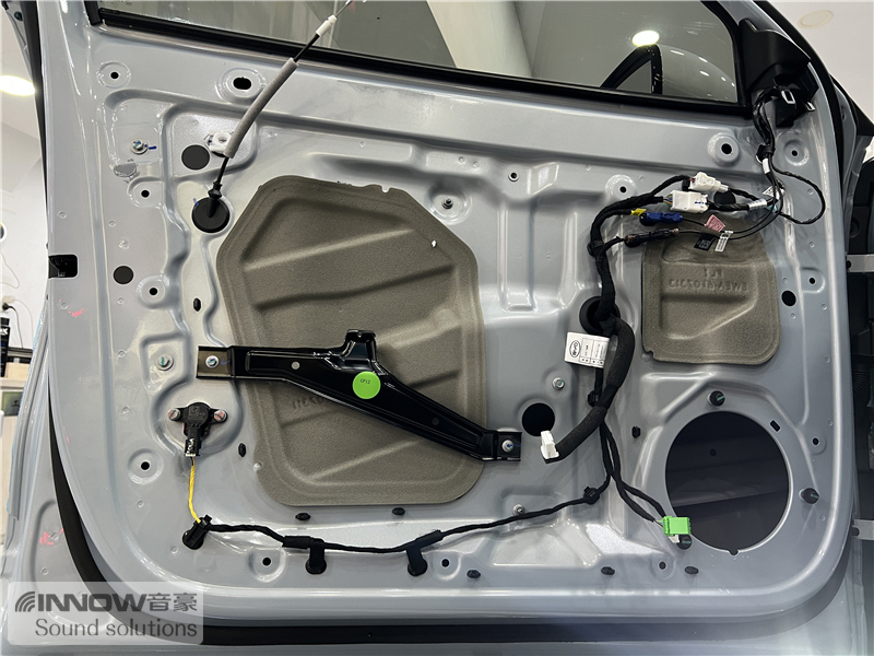 拆开汽车的门板饰盖以后可以看到,原车门板内部隔音措施较为欠缺,门板处产生的噪声会对音响品质产生非常大的影响。技师使用欧洲环保隔音CTK 欧铂止震板对门板及内饰做止振处理,让门板形成一个密封箱体,为声场喇叭创造了一个良好的工作环境。