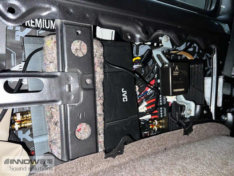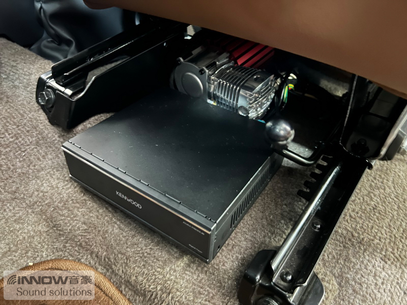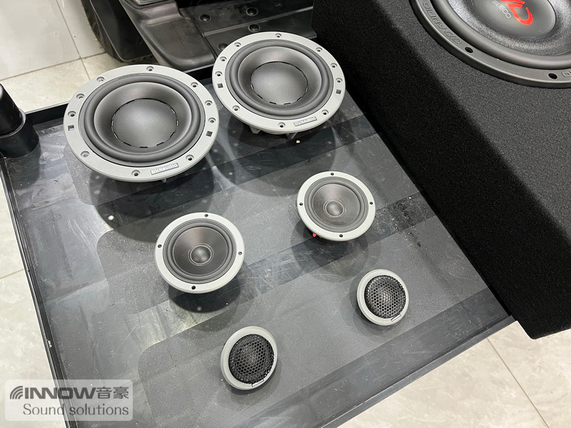 在使用欧洲环保隔音CTK 欧尊止震板,对门板做了双层隔音处理后,技师将前声场喇叭升级成了丹麦丹拿 372三分频喇叭,它的中音和中低音单元使用的是MSP镁硅酸盐混合物音盆,这让音乐的中频部分更加饱满,中低音部分更加沉稳;高音使用的是丝膜球顶设计,可以很好的拉高整体声场,让音乐显得更加通透。德国伊顿 150.4四路功放功放的添加,则解决了声场喇叭功率供给不足的问题,让声场喇叭可以充分发挥出其应有的效果。