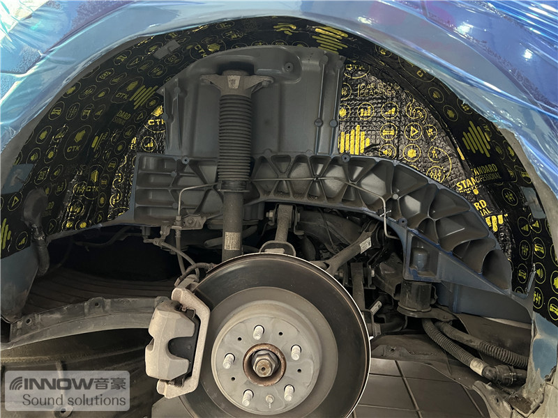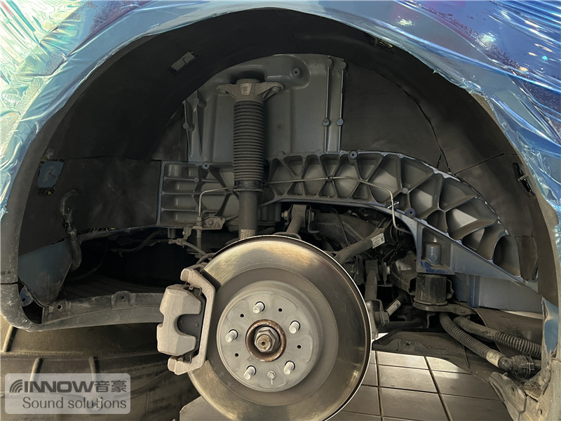 四轮翼子板是路噪和胎噪的主要传入路径,技师先使用欧标止震板对四轮翼子板做止振处理,以减少该部位钣金振动的产生;再使用弹力棉对四轮翼子板做吸音处理,这就切断了路噪和胎噪的传入路径,将此列噪声阻挡在了车厢之外。