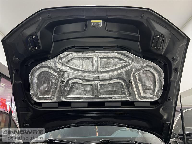 原车引擎盖只是一层铁皮结构,汽车行驶时引擎盖部位很容易产生振动噪声,所以技师先使用欧铂止震板对引擎盖做了止振处理,减少振动的产生;再使用银色棉对引擎盖做吸音处理,将噪声进行吸收,进一步提升隔音的效果。